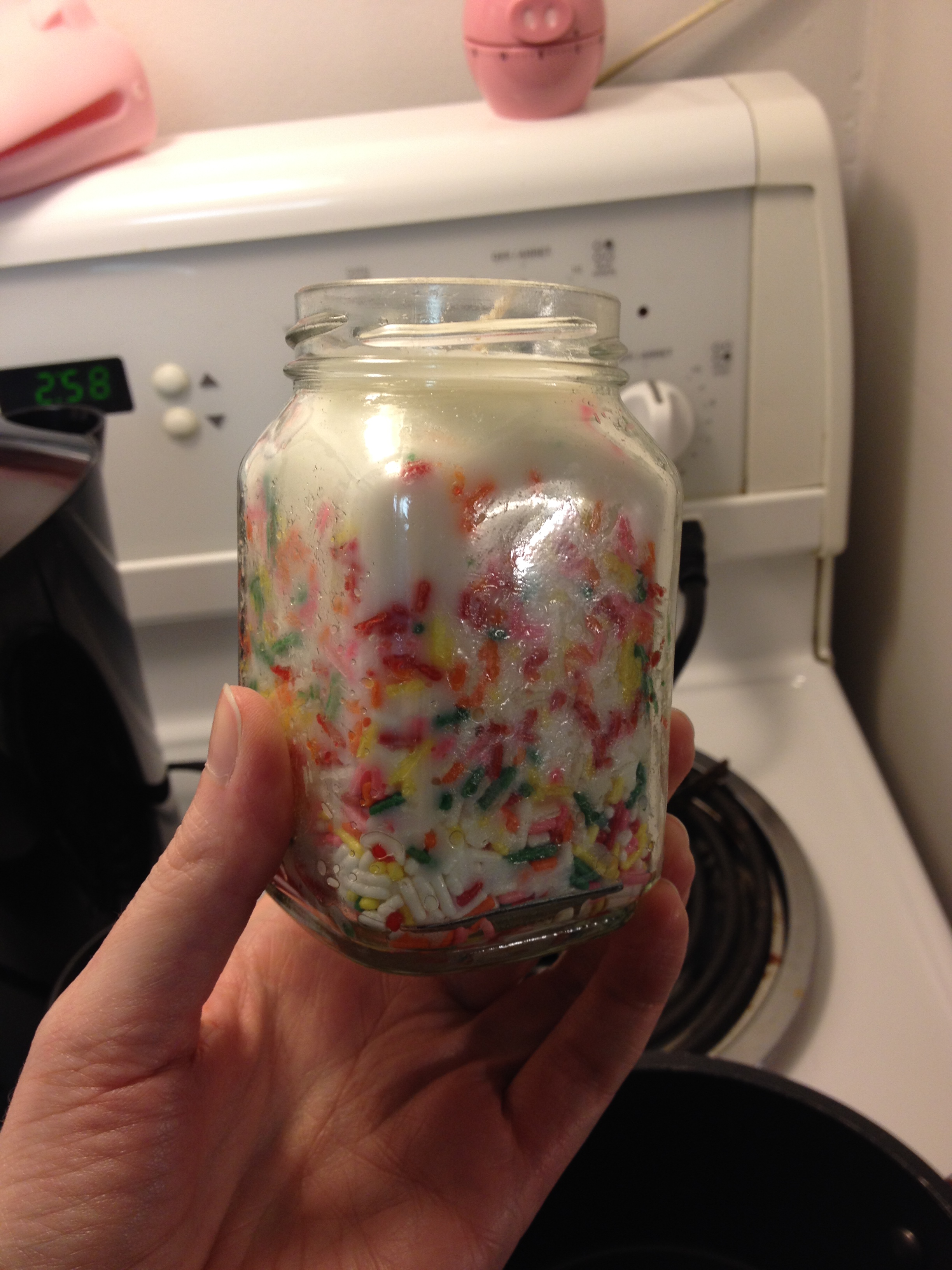 Here you can see how the sprinkles are in no way evenly placed along the side of the jar, and some melted while others didn’t!