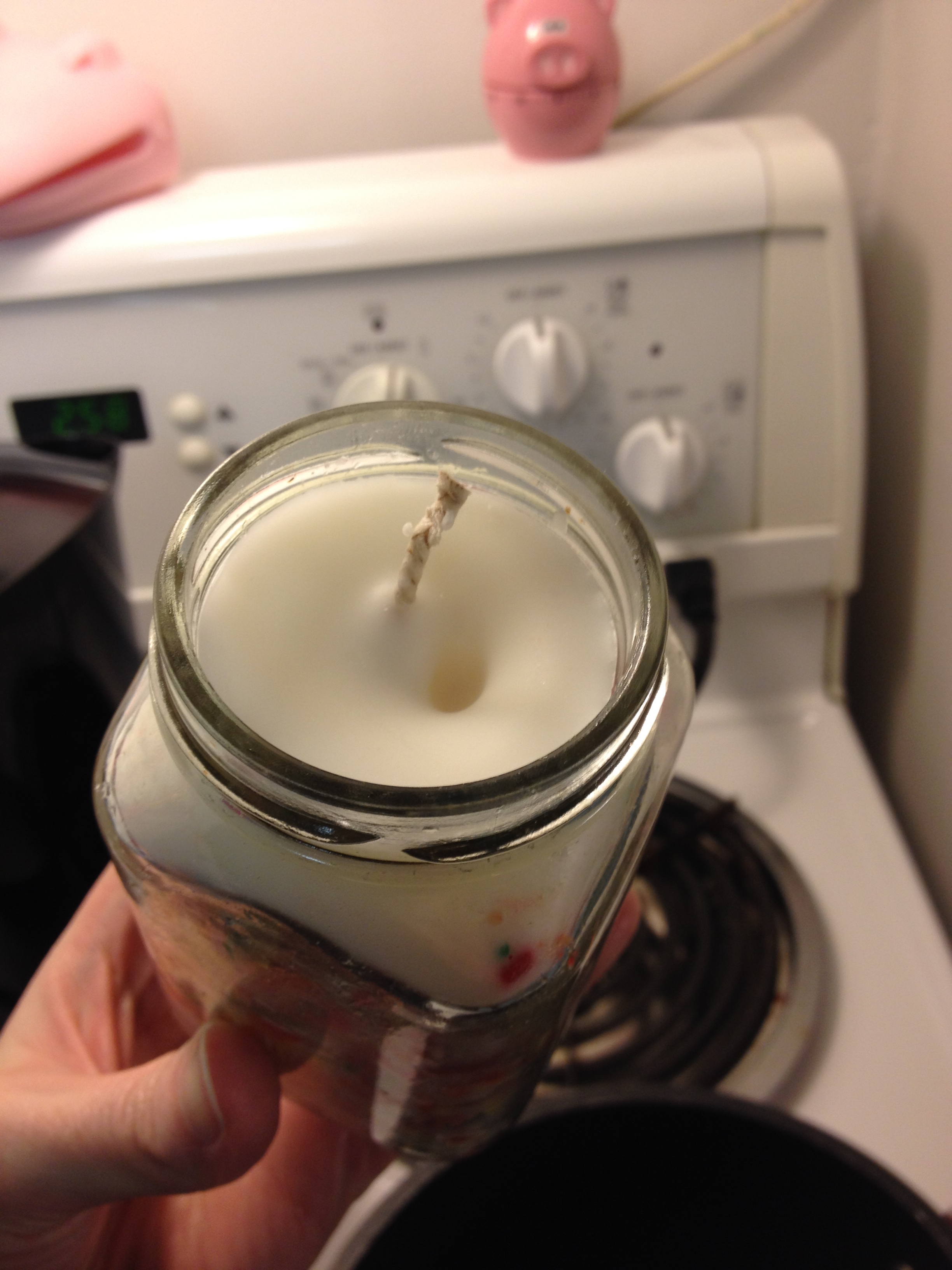 (7) At this point she (and I) poured the wax in to the jar, trying hard to pour in to the middle of the jar so as not to dislodge the sprinkles. She poured all her wax in at once, let it harden, and had a perfect candle. I opted to play the safe route and save a bit of the wax as recommended in other tutorials in case there was a dent. Apparently when a candle hardens sometimes a little dent appears on the top so you save a bit of wax to fill in the dent. My candle was perfect, no dent, but I didn’t know what to do with the extra wax so I re-melted it and poured it in to the jar, kind of topping it up so to speak. Well go figure, when that last little bit hardened it had a dent! I of course had no more wax to fill in the dent sooooo the candle ended up with a dent, oops!
