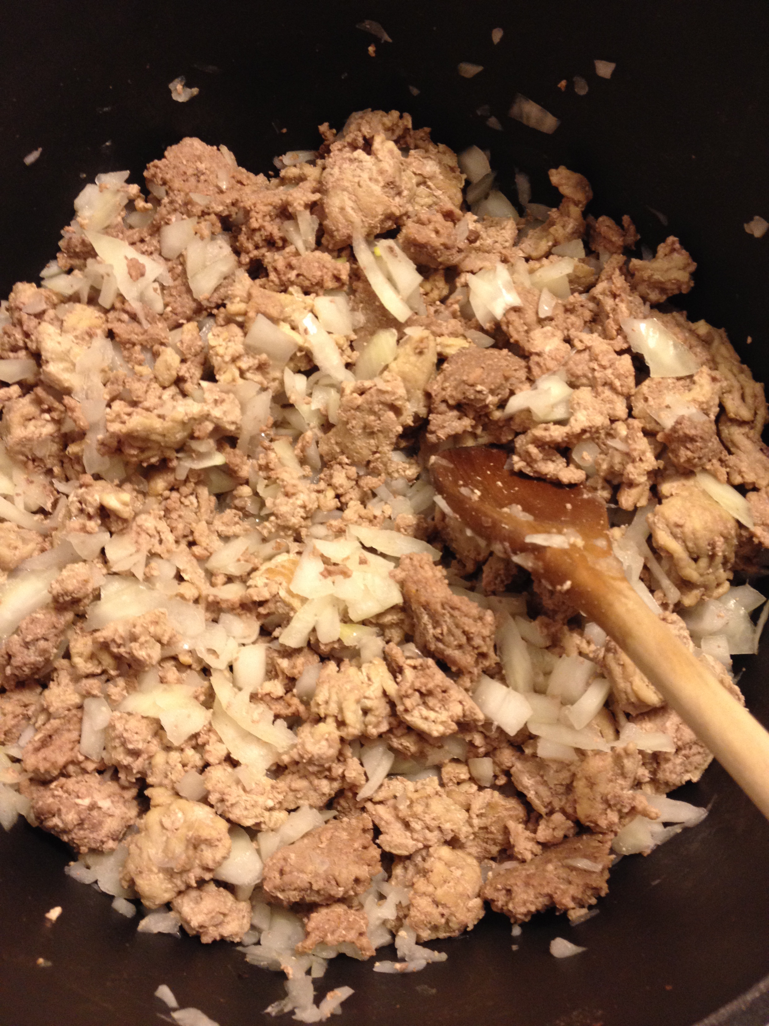 You start with browning the extra lean ground beef, I didn’t have the quantity her recipe called for so I combined extra lean ground beef and extra lean ground turkey. Instead of breaking up in to nice little pieces like mom’s always did my meat stayed in larger chunks, which I didn’t appreciate but didn’t know how to fix lol After the meat is brown you throw in chopped onion and let that cook while you prep the rest of your veggies.