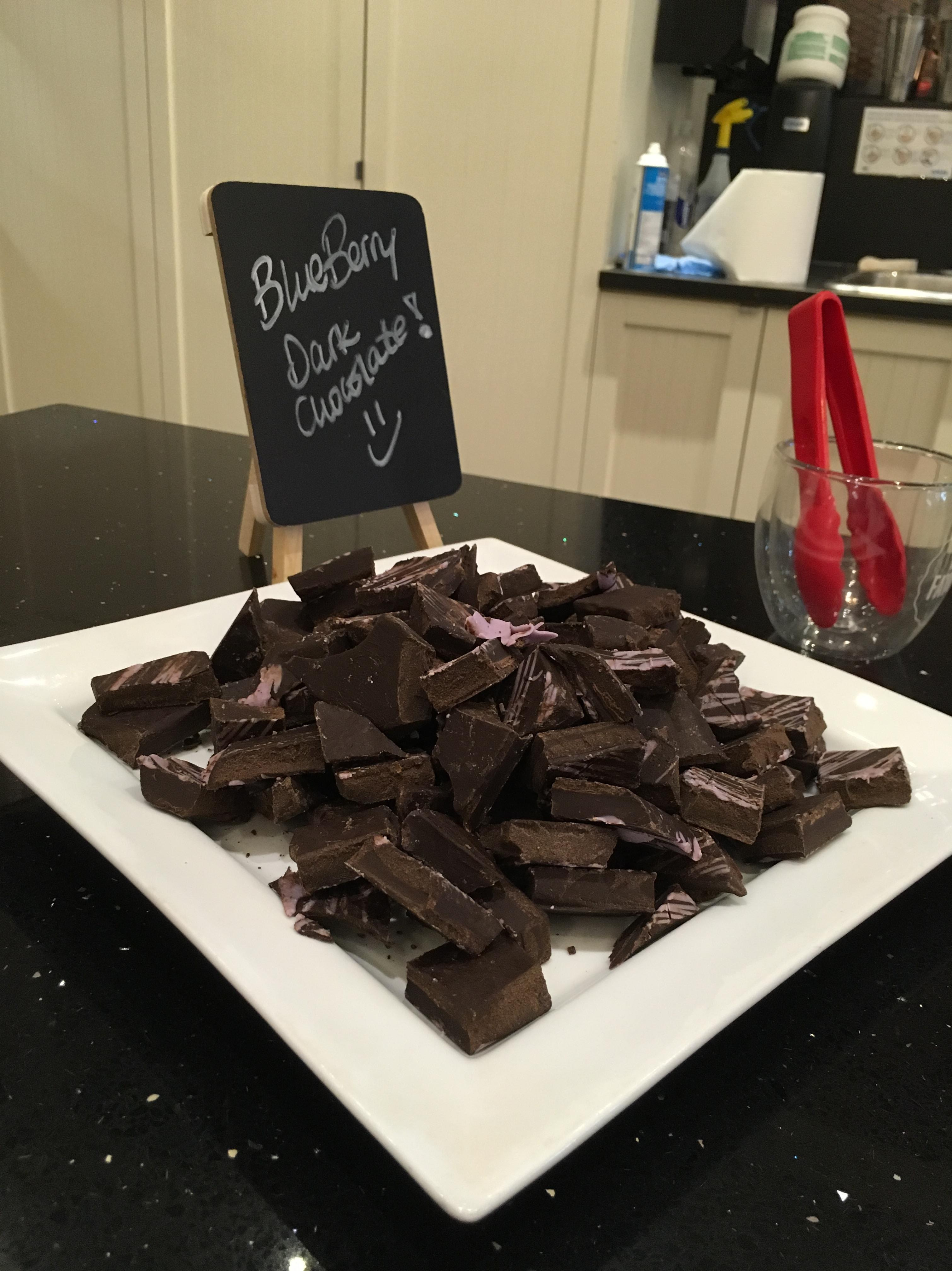 Blueberry Dark Chocolate for sample, proof the universe loves us. Mmm!