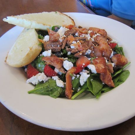 Candied salmon, fresh strawberries, gingered pecans, red onion & Okanagan goat cheese on spinach dressed with our champagne vinaigrette. With garlic panini bread.