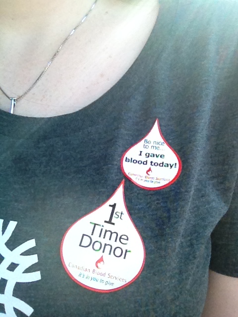 I got a finger jab (props to any diabetics out there who have to do that daily cause that sucked!) and my hemoglobin level was juuuuust barely enough to allow me to donate, looks like I should eat things with more iron in them, oh the things you learn. π Then I answered a loooong list of questions. Then I got taken to a private room where a bunch of questions were read out loud to me by a very kind nurse, these were the more sensitive questions, mostly having to do with sex, and STI’s and, well, that’s mostly it…Then I got taken to the refreshment area because I made a mistake in not eating prior to going to my appointment so I had to eat cookies to get my blood sugar levels up before they would take my blood. Maybe the sugar in the cookies makes it tastier? teehee