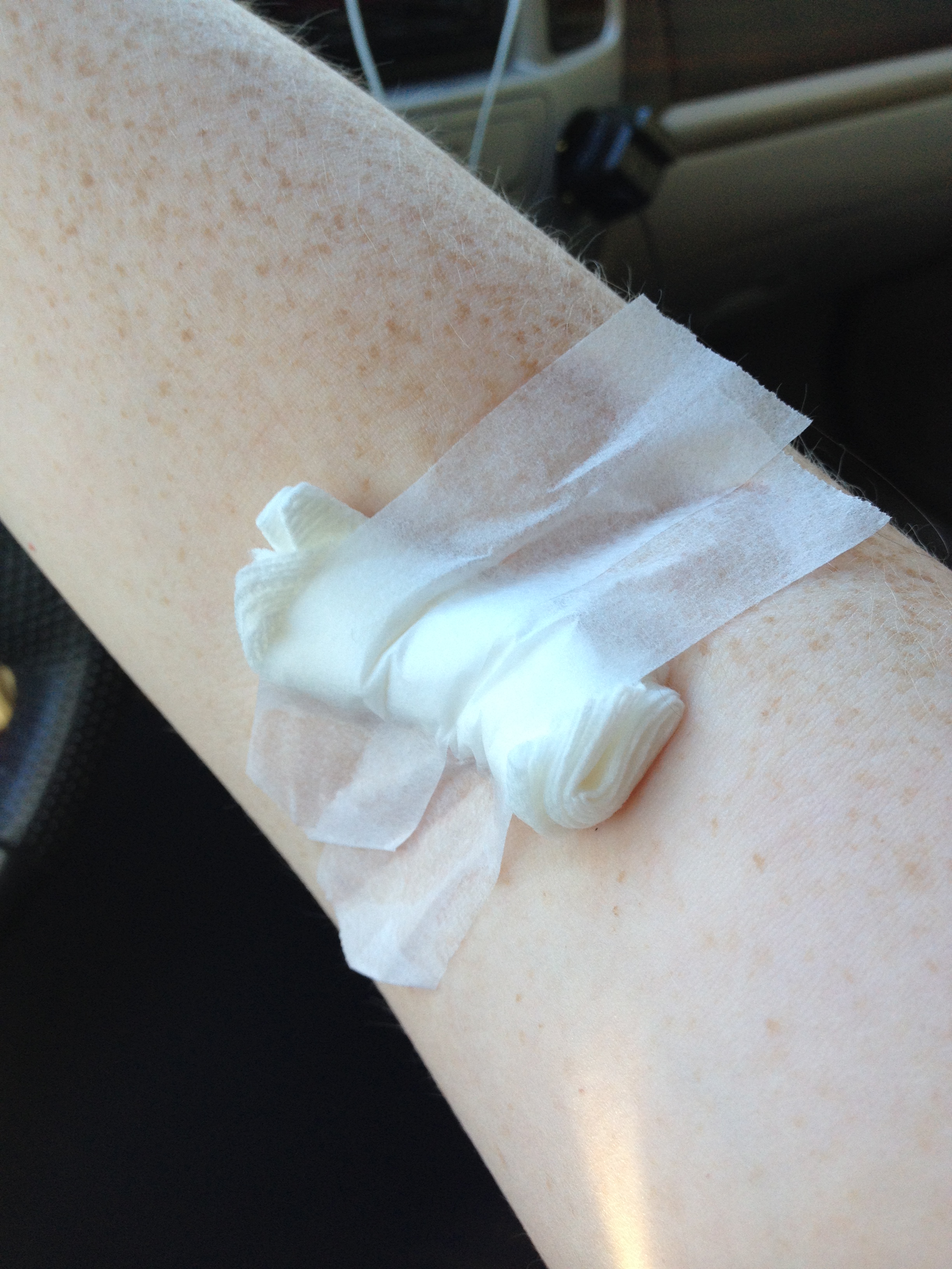 After sitting for five minutes pressing down on the gaping hole in my arm so it would clot I got a bulky bandage made of gauze and was taken back to the refreshment area where I got more juice and cookies…a package of mini chocolate chip this time, Mmm!