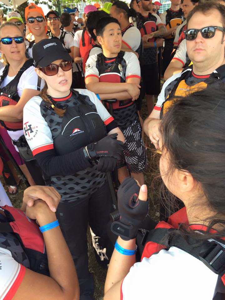 Let me set the scene for what happens when dragon boats collide…the boat with the most momentum tends to go over / into the second boat so the dragon head and part of the boat actually ends up inside the other boat. Since there are people in the way this generally means the dragon head hits or goes over top of a paddler, or two, or three…and sometimes hands and paddles get squished between the boats. Sometimes boats tip, sometimes they don’t, there are a lot of factors that decide that.